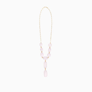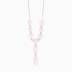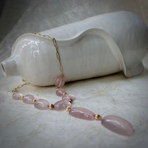 Natural elements meet modern sophistication with this line of fine jewelry. This one-of-a-kind Pink Quartz cabochon necklace is delicate yet impressive. It can be worn seamlessly from day to evening. This piece has a timeless appeal yet makes a statement. The Pink Quartz was hand selected by the designer and set with 14 Karat yellow gold rounded beads on a 14 Karat yellow gold paperclip style chain. Handcrafted in New York City.