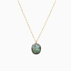 Natural elements meet modern sophistication with this line of fine jewelry. This one-of-a-kind Turquoise was hand selected from a mine in the American West and adorned with high quality diamonds to showcase its complex beauty. This pendant, worn alone, has a timeless appeal and can move seamlessly from day to evening. It can also be layered with other pieces for a more dramatic effect. Shown with 16 inch paperclip style chain in solid 14-karat yellow gold. Handcrafted in New York City.
