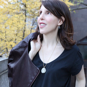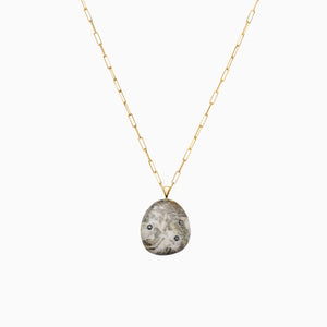 Natural elements meet modern sophistication with this line of fine jewelry. This one-of-a-kind pebble was hand selected in nature and adorned with high quality black diamonds to showcase its complex beauty. This pendant, worn alone, has a timeless appeal and can move seamlessly from day to evening. It can also be layered with other pieces for a more dramatic effect. Pendant shown on 18-inch paperclip style chain in solid 14-karat yellow gold. Handcrafted in New York City.