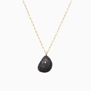 Natural elements meet modern sophistication with this line of fine jewelry. This one-of-a-kind pebble was hand selected in nature and adorned with high quality diamonds (0.05) to showcase its complex beauty. This pendant, worn alone, has a timeless appeal and can move seamlessly from day to evening. It can also be layered with other pieces for a more dramatic effect. Pendant shown on 16-inch paperclip style chain in solid 14-karat yellow gold. Handcrafted in New York City.
