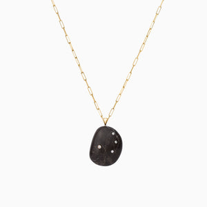 Natural elements meet modern sophistication with this line of fine jewelry. This one-of-a-kind pebble was hand selected in nature and adorned with high quality diamonds to showcase its complex beauty. This pendant, worn alone, has a timeless appeal and can move seamlessly from day to evening. It can also be layered with other pieces for a more dramatic effect. Pendant shown on 16-inch paperclip style chain in solid 14-karat yellow gold. Handcrafted in New York City.