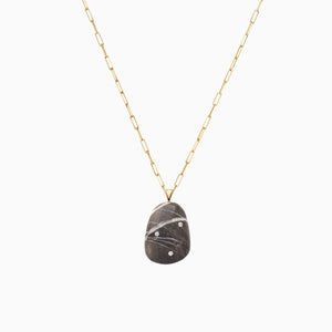 Natural elements meet modern sophistication with this line of fine jewelry. This one-of-a-kind pebble was hand selected in nature and adorned with high quality diamonds to showcase its complex beauty. This pendant, worn alone, has a timeless appeal and can move seamlessly from day to evening. It can also be layered with other pieces for a more dramatic effect. Pendant shown on 16-inch paperclip style chain in solid 14-karat yellow gold. Handcrafted in New York City.Â
