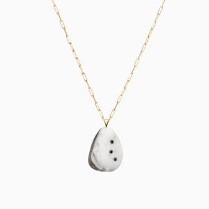 Natural elements meet modern sophistication with this line of fine jewelry. This one-of-a-kind pebble was hand selected in nature and adorned with high quality black diamonds to showcase its complex beauty. This pendant, worn alone, has a timeless appeal and can move seamlessly from day to evening. It can also be layered with other pieces for a more dramatic effect. Pendant shown on 16-inch paperclip style chain in solid 14-karat yellow gold. Handcrafted in New York City.