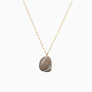 Natural elements meet modern sophistication with this line of fine jewelry. This one-of-a-kind pebble was hand selected in nature and adorned with high quality diamonds to showcase its complex beauty. This pendant, worn alone, has a timeless appeal and can move seamlessly from day to evening. It can also be layered with other pieces for a more dramatic effect. Pendant shown on 16-inch paperclip style chain in solid 14-karat yellow gold. Handcrafted in New York City.
