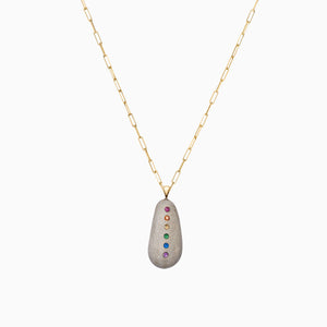 Natural elements meet modern sophistication with this line of fine jewelry. Show off your pride with this one-of-a-kind pebble that was hand selected in nature and set with a rainbow of sparkling gemstones to showcase its complex beauty. This pendant, worn alone, has a timeless appeal and can move seamlessly from day to evening. It can also be layered with other pieces for a more dramatic effect. Pendant shown on 18-inch paperclip style chain in solid 14-karat yellow gold. Handcrafted in New York City.